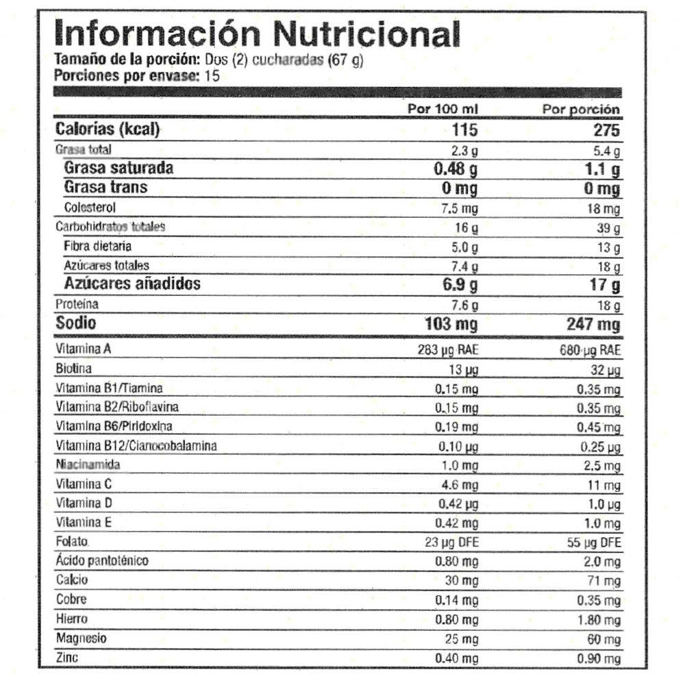 Con solo 120 calorías por porción, su composición incluye saborizantes, edulcorantes y colorantes naturales, ofreciendo un agradable sabor a vainilla para una experiencia deliciosa y saludable
