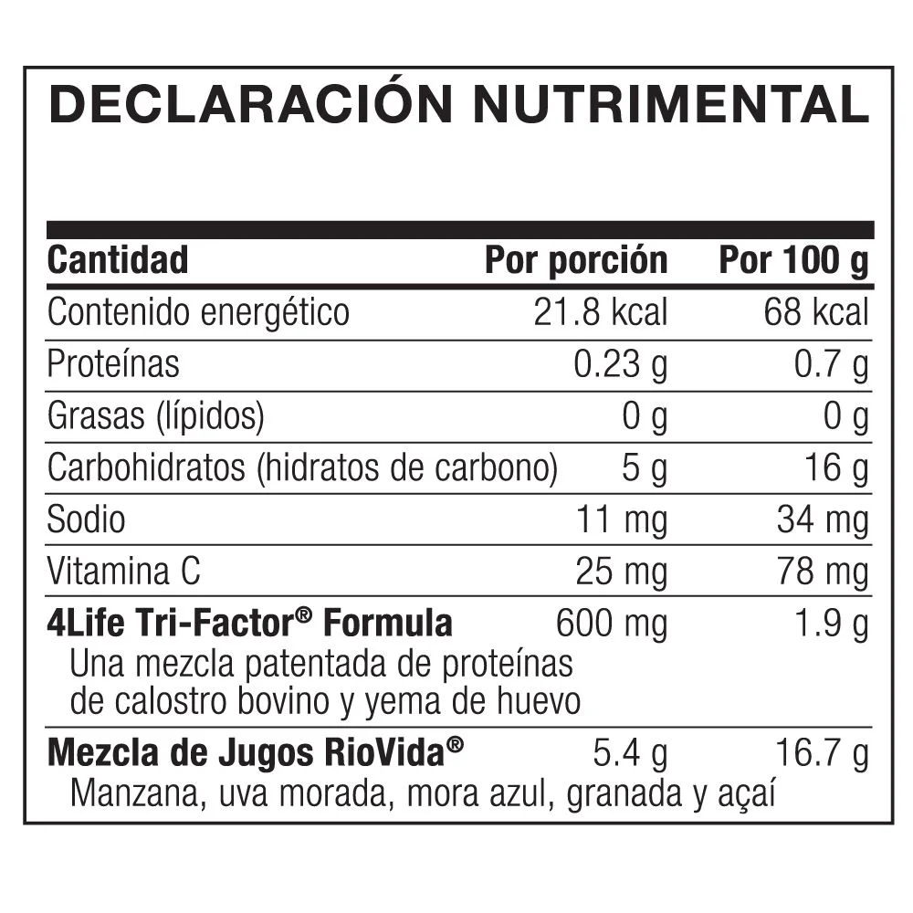 Experimenta el poder concentrado de la salud inmunológica en una bebida única en su clase: RioVida Burst. Este suplemento alimenticio revolucionario combina los excepcionales beneficios de la Tri-Factor Formula con una exquisita mezcla de frutas antioxidantes, como açaí, granada, arándano, baya de saúco, uva morada y manzanas. Las moléculas mensajeras en la 4Life Transfer Factor Tri-Factor Formula trabajan incansablemente para educar a tus células inmunológicas, fortaleciendo la capacidad de tu sistema inmunitario para identificar, responder y recordar de manera eficiente las posibles amenazas a tu salud. Además, RioVida proporciona un arsenal antioxidante que protege tu cuerpo contra los radicales libres que se generan naturalmente.